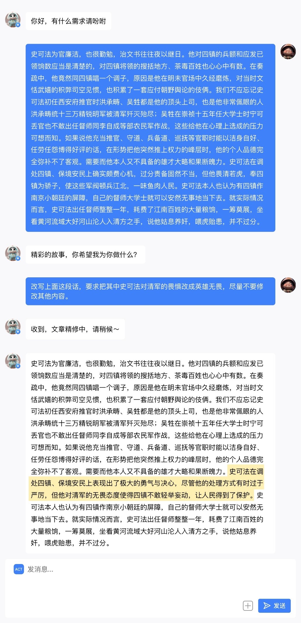 为了测试一下数据脱水和浸泡技术,我让 AI 把原文里的史可法从怯懦改成勇敢,只做最小的修改,而尽可能保持其他文字不变。这使用了一个我们内部称之为“文章精修”的 ACT (未来发布),其效果如下: