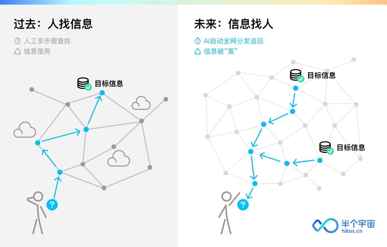 如果能改变信息的流向,就能解决这些问题。即从“人找信息”,向“信息找人”发生转变。当人有一个需求之后,应当是信息主动找上来,自动给出一个全网最优解,而节约大量的时间和精力。这个最优解,不应该有商业广告的干扰。