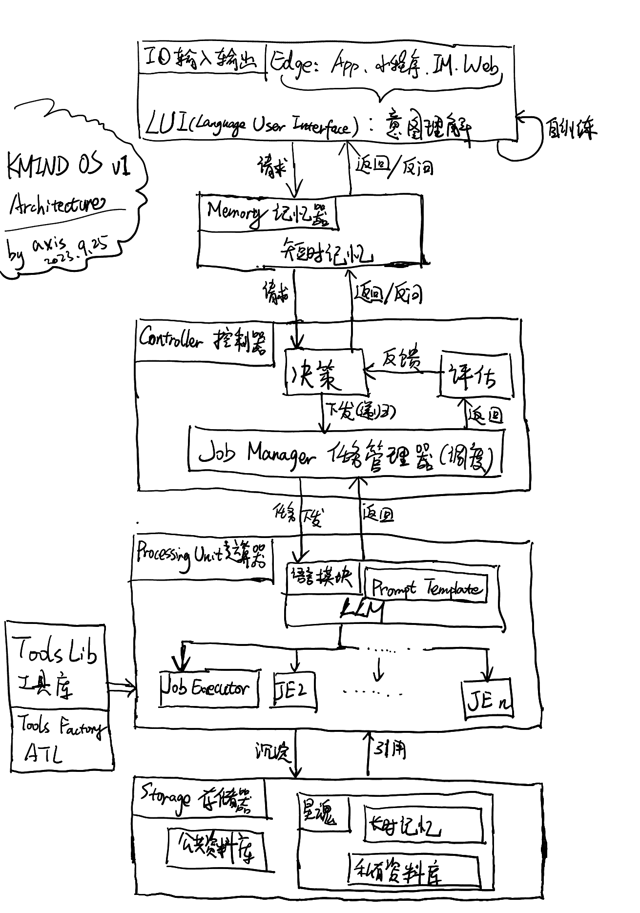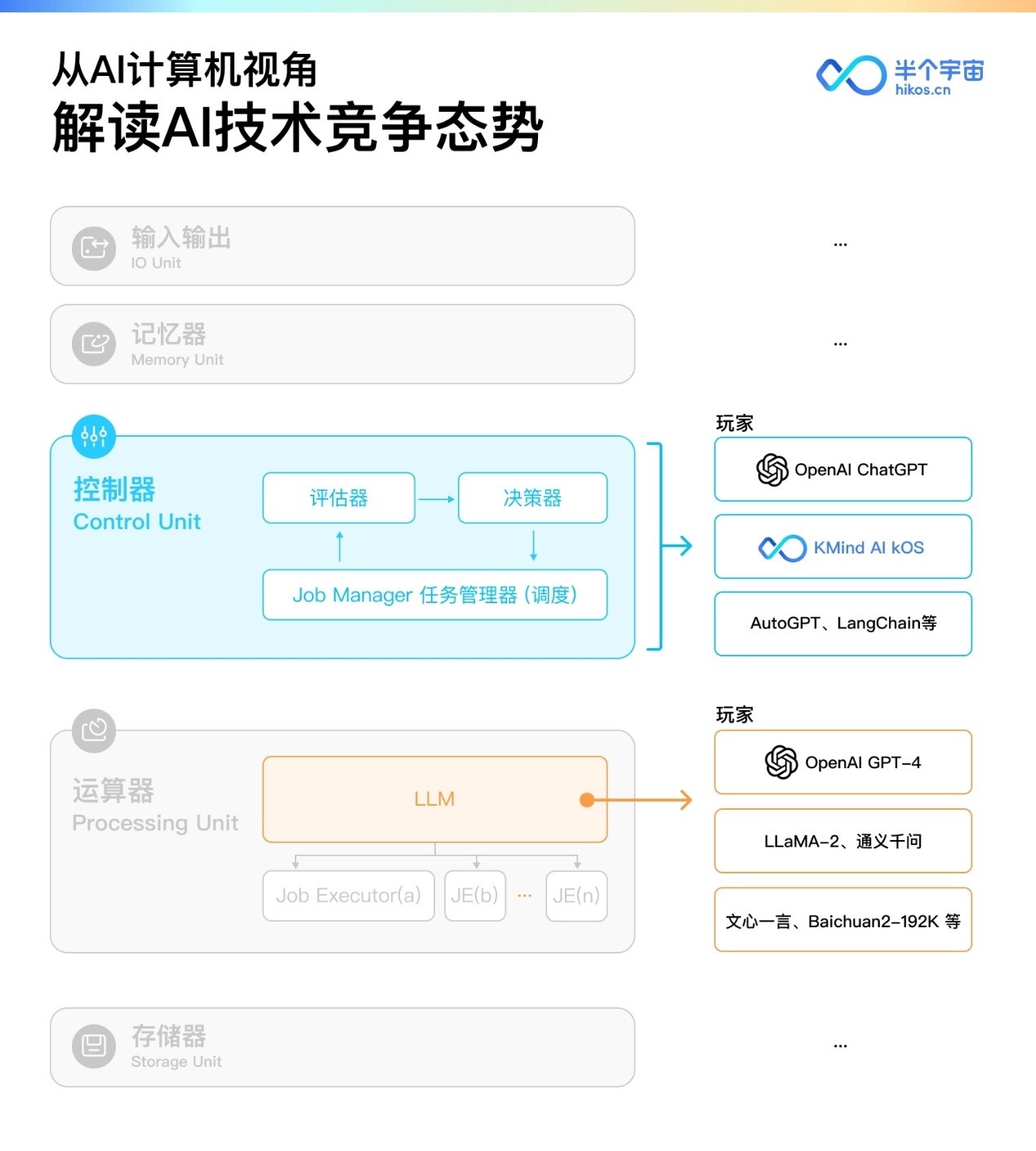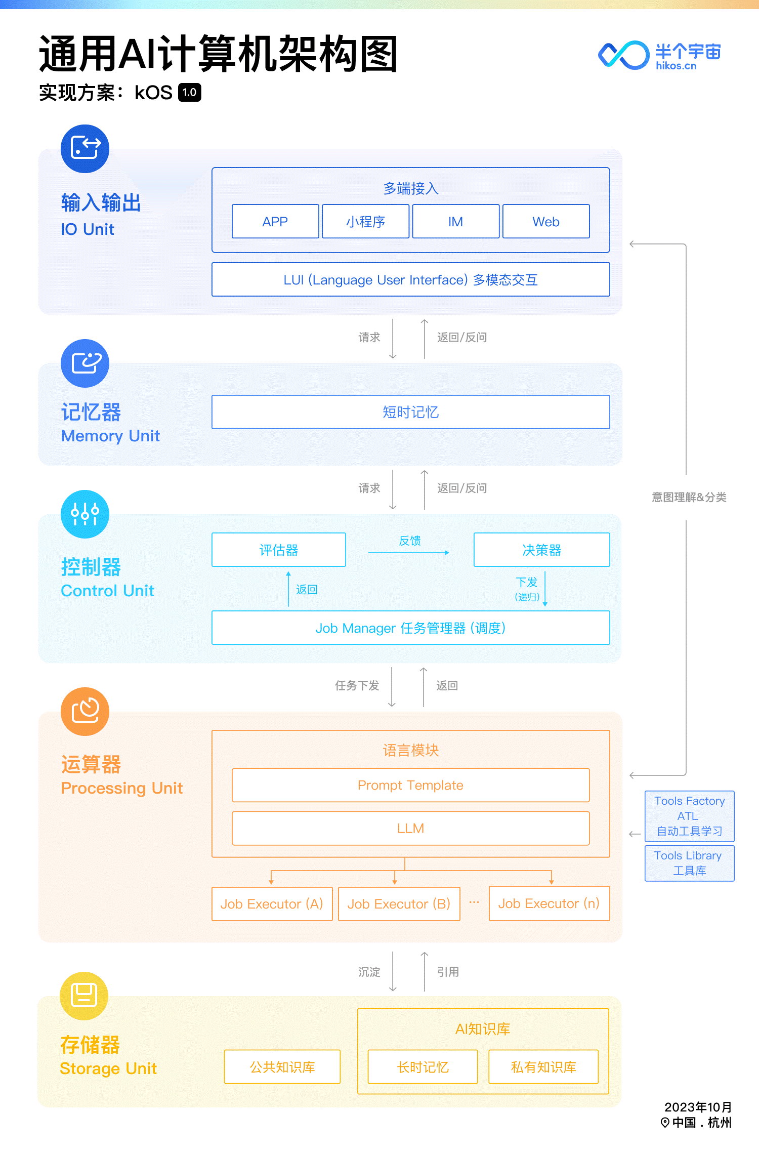 这五个月以来,我们做了诸多尝试,并迅速积累了超过十万用户。一开始我们基于 GPT来实现我们的 AI,在国内的监管要求出台后,我们切换到了国产 LLM和开源 LLM的路线上。由于有着真实的用户基础,因此我们很清楚 LLM的能力和缺陷。能力是我们要充分发挥的,这是时代红利;缺陷是我们要弥补的,这是建立核心技术壁垒的机会所在。这样我们在创业三个月后,越来越清楚我们的目标到底是要做什么。于是在两个月前,我们在公司内部明确了“个人 AI计算机”这一理念,并提出了 kOS-1.0新型计算机架构设计。