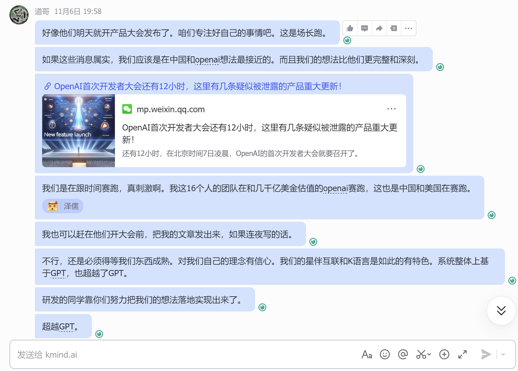 也因此, KMind和 OpenAI之间的赛跑,将会是 LLM之外的赛跑。这也是中国和美国在这个方向上的技术赛跑。当我意识到这一点,是在 11月 6日的晚上,离 OpenAI召开产品发布会不到 10个小时,彼时我开始焦虑,以下是当时在工作群里和小伙伴们说的话: