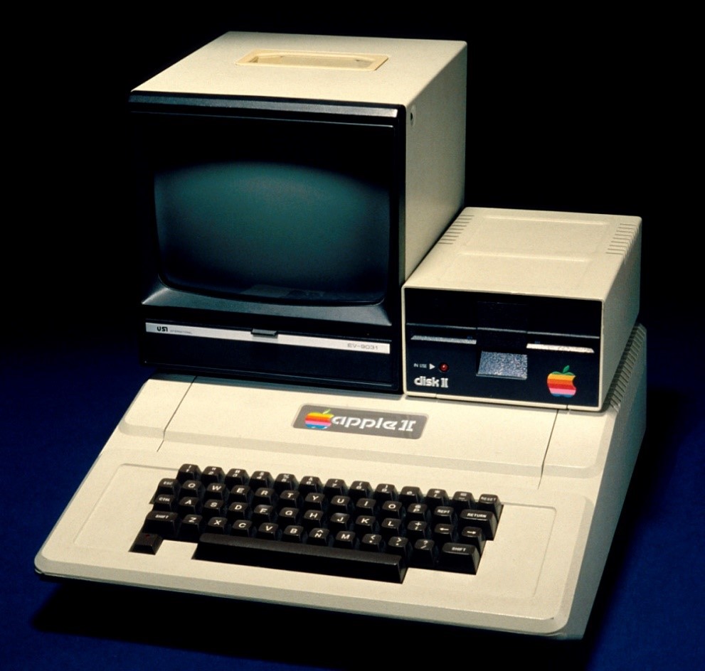 也因此最终在 1977年,苹果公司的乔布斯和沃兹尼亚克将所有的计算机相关组件、技术组合封装为一个整体,发布了最早的一体化个人计算机产品: Apple II,它将计算机的运算器件装在一个盒子里,并带有独立显示器和键盘。这是一台完整的个人计算机。而比尔·盖茨和保罗·艾伦在那个年代则创立了微软公司,以开发软件为主,通过售卖软件授权的方式,微软公司最终成功的让每个家庭拥有了一台计算机,家喻户晓。